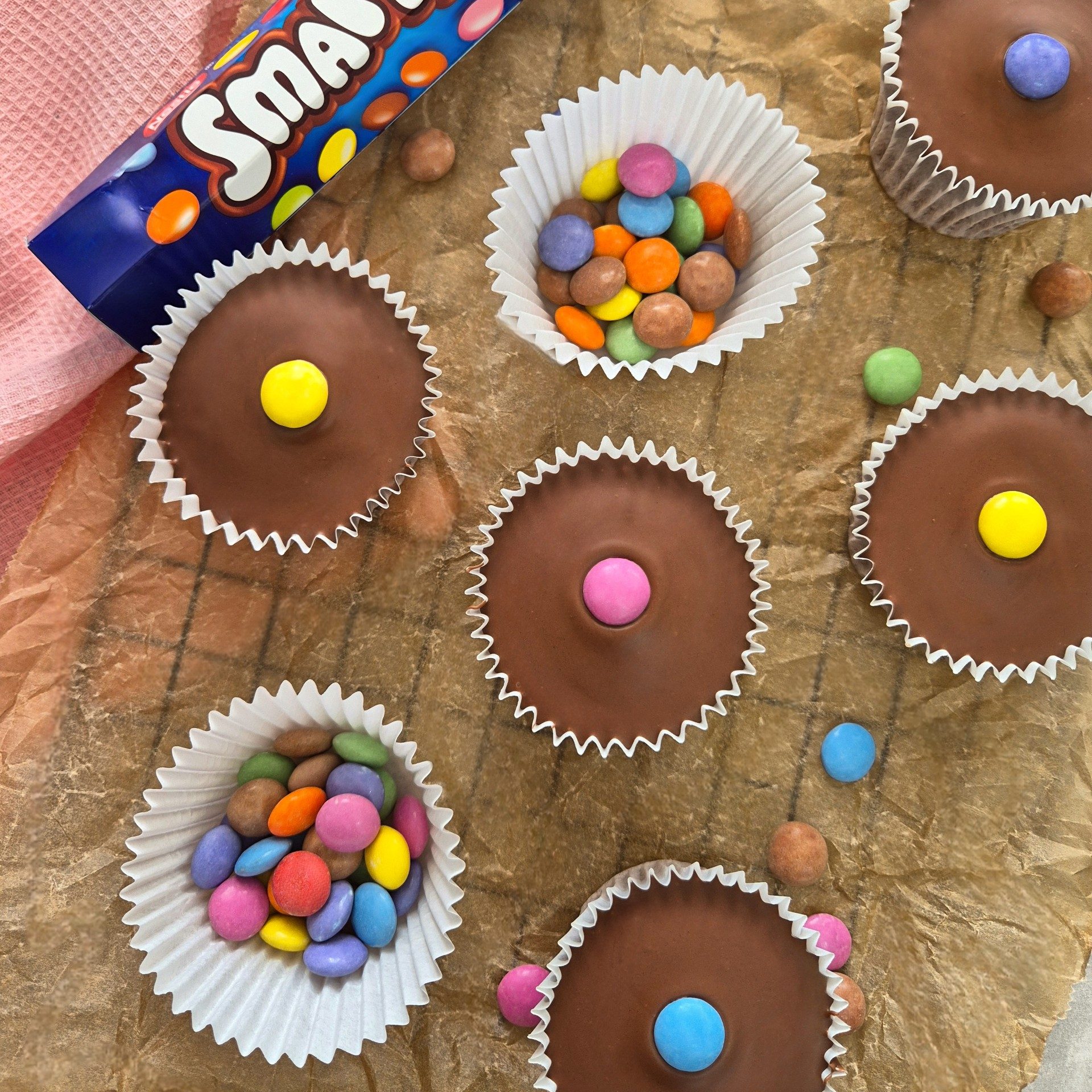 - Melt your chocolate in a microwaveable bowl. Top your cupcakes to the top of the muffin cases with melted chocolate, decorate with smarties and set in the fridge until the chocolate has set!