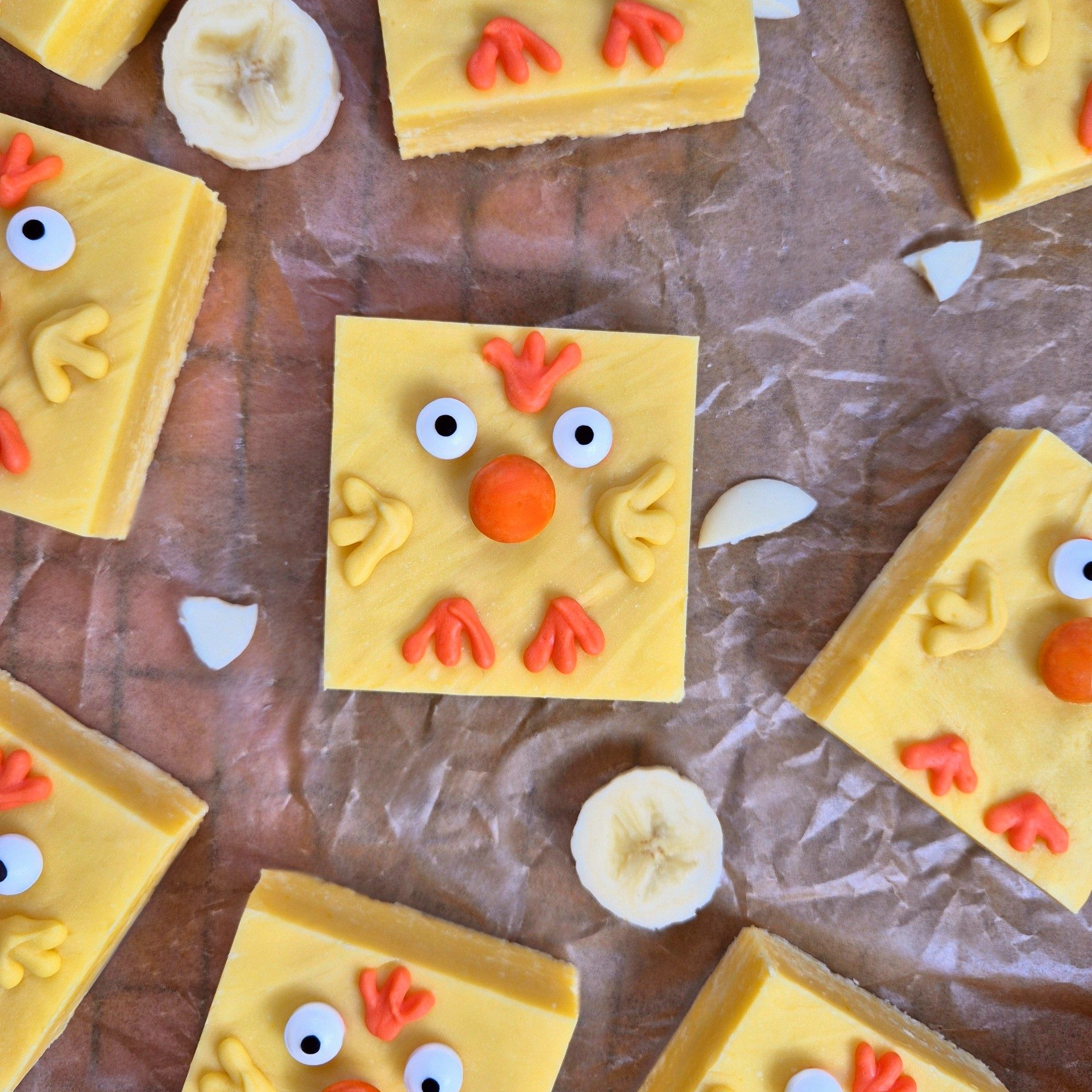 - Once set, slice into 9 pieces then decorate. Melt a small amount of white chocolate and colour it orange. Pipe onto the fudge to create chick features. Add orange smarties for beaks and edible eyes to bring the Easter chicks to life.